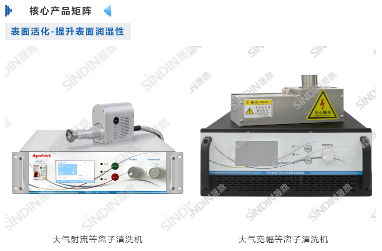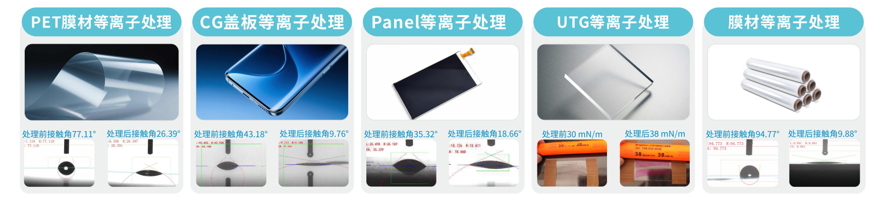 等離子可用于PET膜材、PanelUTGCG蓋板等材料表面預處理,提高材料表面潤濕性,改善界面結合力,從而提升后續貼合、
