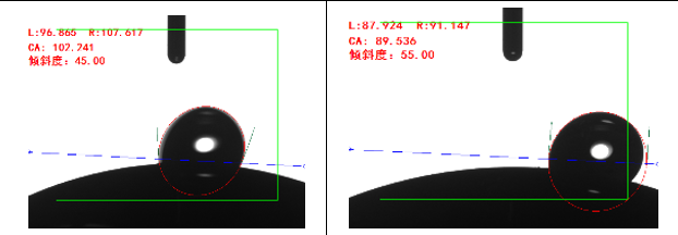 車載攝像頭要求避免水滴聚集,需要克服水珠聚集而導致全景攝像頭取景模糊的缺陷,因此對于攝像頭滾動角的要求非常高。傾斜型接觸角測量儀可有效的測量材料表面滾動角,有效表征產品表面前進后退角,可以評判產品表面疏水性能。