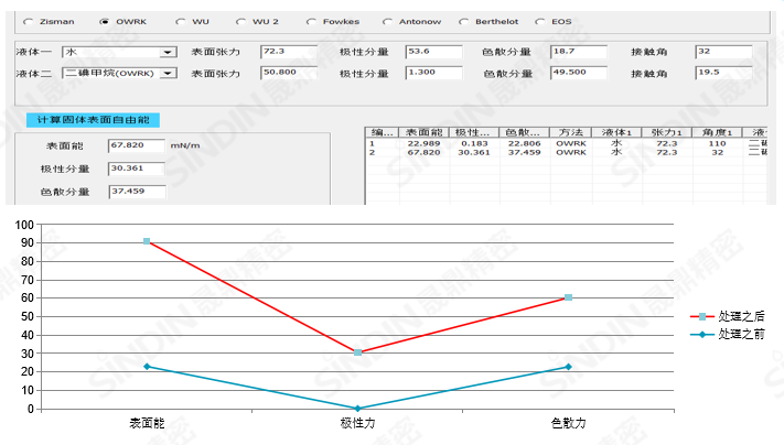 等離子處理完成后,可使用接觸角測量儀驗證其處理后的效果,通過對比前后的接觸角數據、極性分量、色散分量、表面能等數值有效分析和判斷等離子處理的有效性。